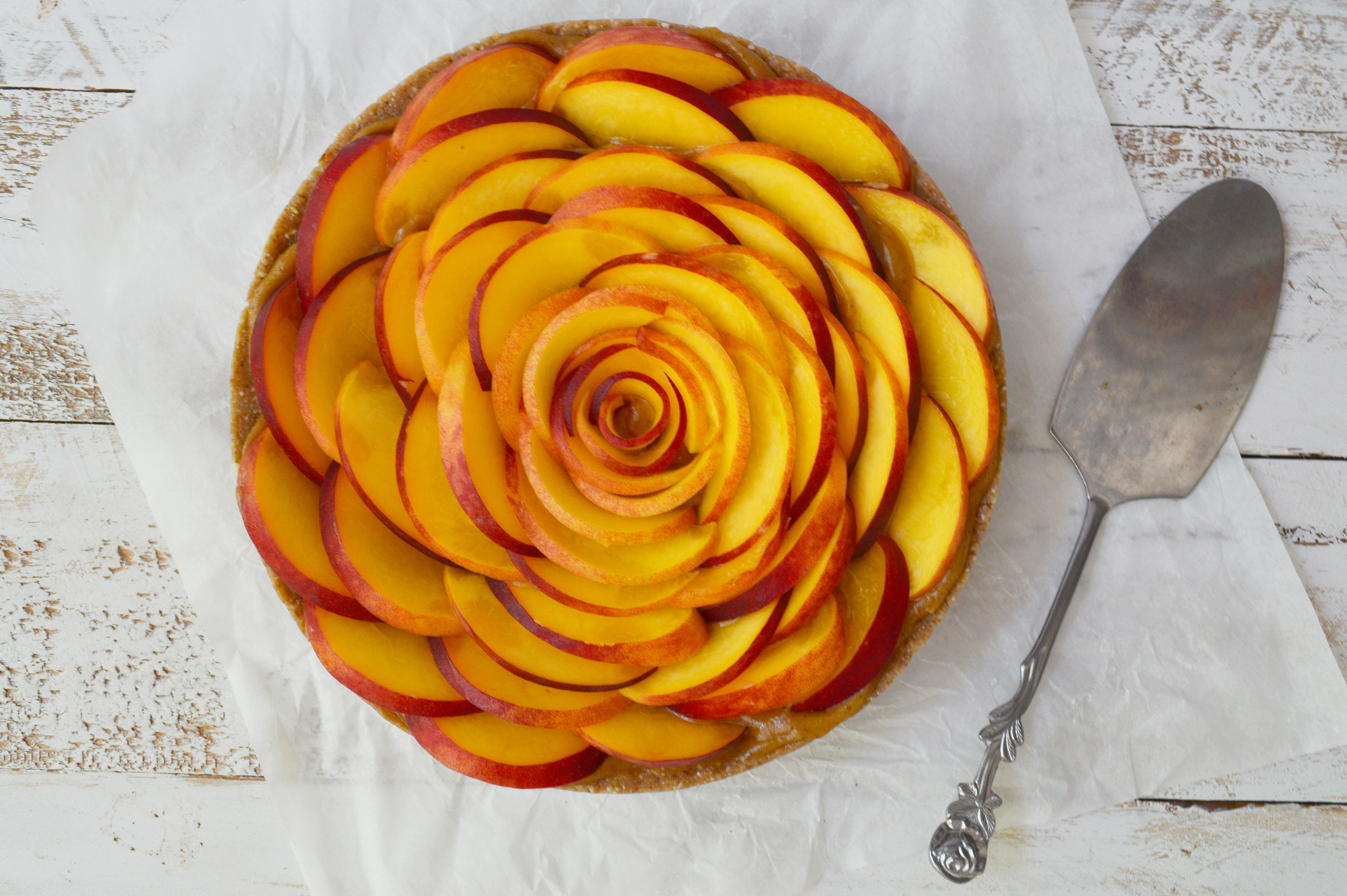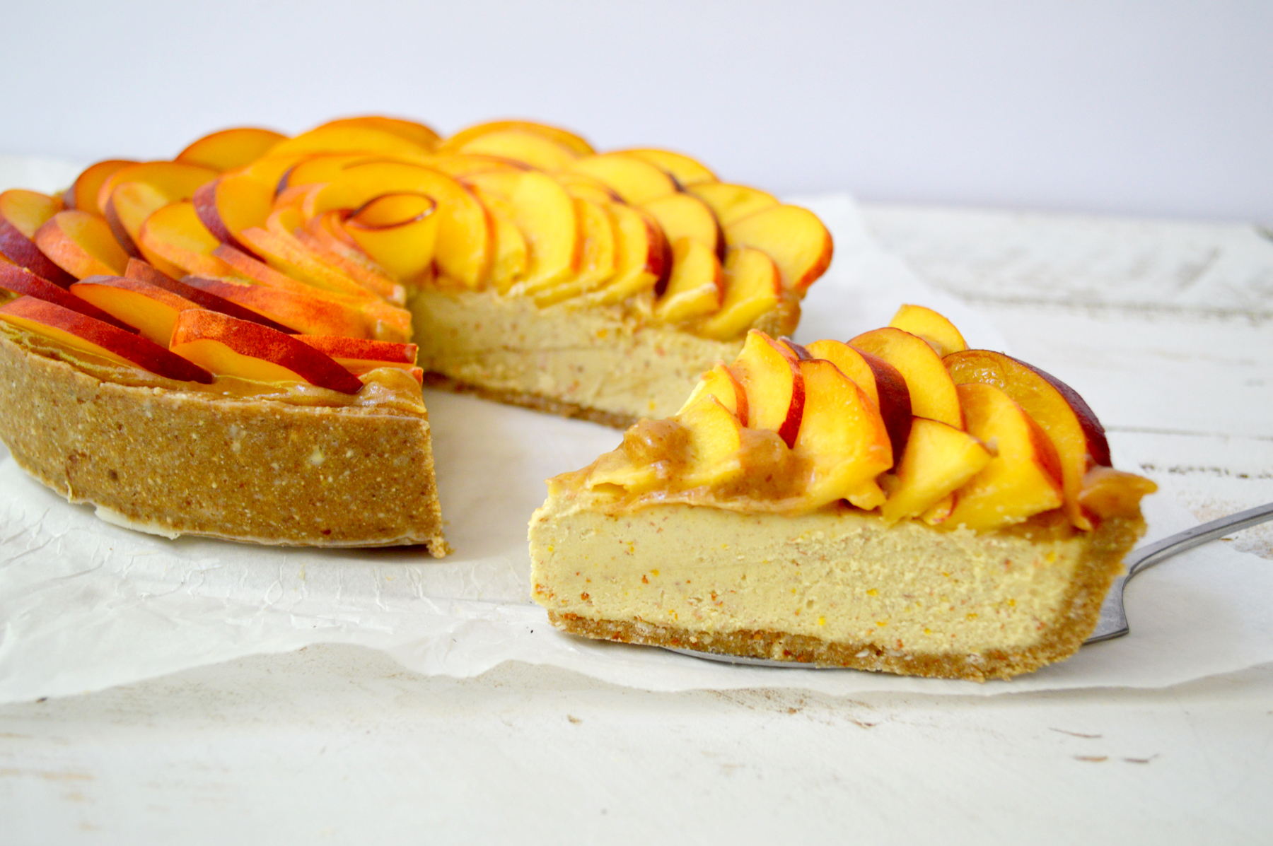 Summer has some amazing fruit to offer! One of my all time favs is peaches which provide lots of nutrients a low calories. They also provide minerals such as potassium, contain lots of antioxidants and fibre. To talk you through the cake I made the base with almonds, dates and buckwheat which gave it an extra crunch, coconut and natural spices such as cinnamon, ginger and cardamon. The filling is made with cashews, orange, lemon, almonds which gives it a fresh citrus flavour. The salted caramel cream is made with delicious dates, almond milk, and a small amount of sea salt… Date caramel is Ahhhhmazing! Then I topped the cake off with thinly sliced peaches and turned into a very beautiful finishing touch.